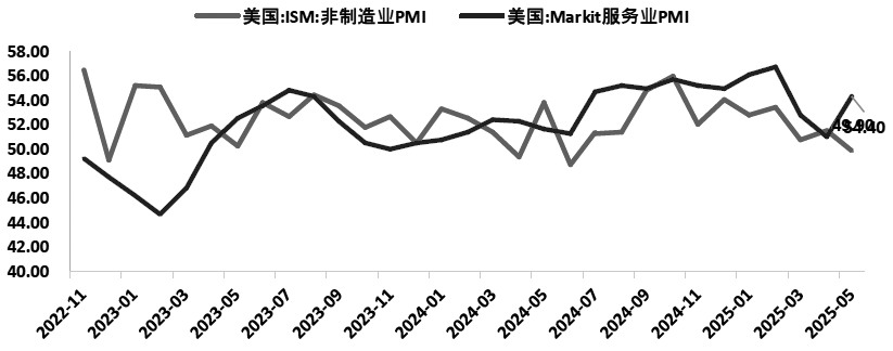 6月4日,美国供应管理协会(ISM)公布了5月的服务业PMI数据,这一数据同样给美国经济敲响警钟。此次ISM的服务业PMI仅为49.9,不仅低于预期的52.2,还低于4月的51.6,创下去年6月以来的最低水平,并且首次跌入萎缩区间。其中,新订单指数从52.3直接降至46.4,创下2022年12月以来的新低。新订单指数的下降预示着未来需求的萎缩,这也是PMI被拖累的最重要原因。服务业产出指数刚好处于50的荣枯线附近,低于4月的53.7。就业情况稍有好转,从4月的49升至50.7。价格指数上升明显,从4月的65.1升至68.7,创下2022年11月以来的最高水平。近期的关税政策可能是推动价格指数上升的关键因素。