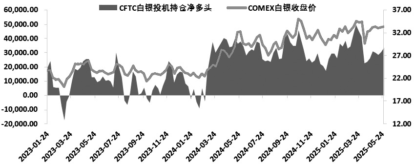 图为CFTC白银期货投机持仓净多头变化与COMEX白银收盘价(单位:吨、美元/盎司)