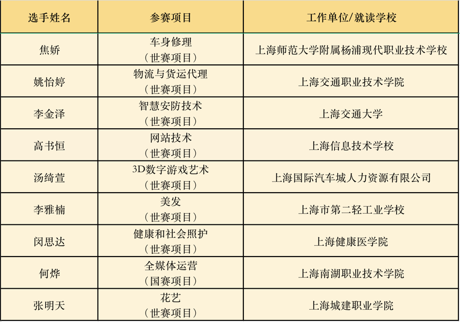 从获奖情况来看,上海选手在本市“3+6”重点产业以及“五个中心”建设相关比赛项目占据领先地位。世赛新增赛项、人工智能与信息技术融合的智慧安防技术项目成功摘金;汽车产业的车身修理项目、生命健康产业的健康和社会照护项目、电子信息产业的网站技术项目、时尚消费产业的花艺、美发项目均取得最高奖项,其中花艺项目包揽了金、银牌,车身修理项目实现“三连冠”;物流与货运代理项目中,上海选手实现了国赛“三连冠”。同时,上海选手还获得了全媒体运营师、3D数字游戏艺术项目金牌以及珠宝加工项目银牌,展现了上海建设互联网优质内容创作集聚区、打造国际数字之都、国际珠宝时尚功能区等战略布局的高质量发展成果。此外,上海选手在民生保障、先进制造等领域也表现亮眼,养老护理、数控车等项目获得银牌,育婴、口腔修复工艺技术、智能硬件装调等项目获得铜牌。